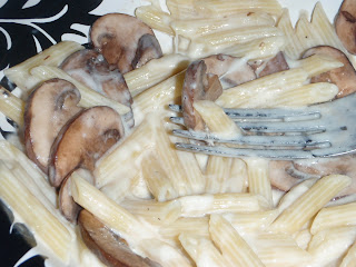 The directions are super easy: Melt the butter in a saucepan over low heat. Remove from heat, add cream, salt, pepper and parmesean cheese. Return to heat and stir until ingredients are combined and cheese is melted. Do not boil. Add the mozzarella cheese and stir until melted/almost melted. Toss with your favorite pasta, and add whatever you want - veggies, meats, fish. This is a perfect base for lots of pasta dishes and it's easy to get creative with this one! I served it over baby penne and added sauteed mushrooms.
